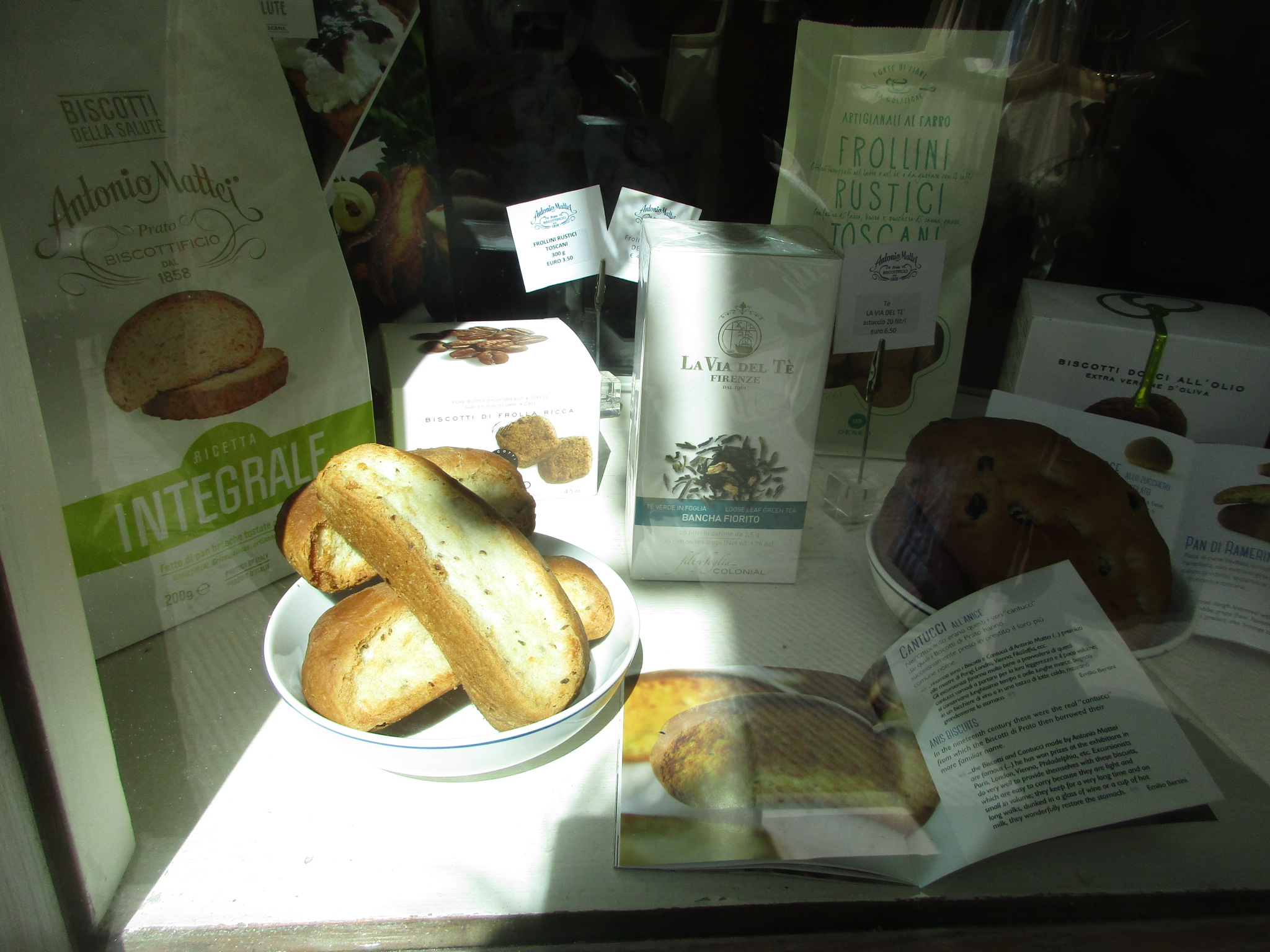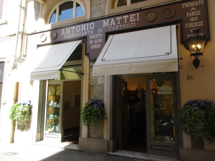 このロゴや包み紙に見覚えガある方も多いのでは?フィレンツェやシエナなどの食材店や食材コーナーには必ず、と言ってよいほど販売されているのが、このアントニオ・マッティのカントゥッチ―二。お店はプラートの旧市街、コムーネ広場から目抜き通りを進んだ左側にあります。1867年のパリ万博など数々の賞を受賞し、カントゥッチ―二の伝統を守るビスコッティフィーチョとして160年!続く老舗となっています。