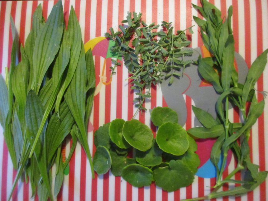 野草講座に参加したとき、覚えられそうなもの&食べてみたいものを少しだけ採ってきました。左が「野ウサギの耳」、中央上が婦人会重鎮のおばあちゃんにもらった「ピンピネッラ」、中央下が肉厚の「ヴィーナスのへそ」、右がマリアにもらった「ストレーゴリ」。