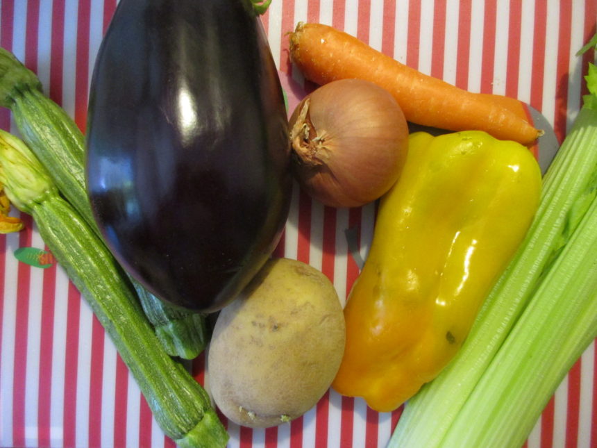 ◎玉ねぎ・1個 ◎人参・1本 ◎セロリ・1本 ◎カラーピーマン・1個 ◎ズッキーニ・2本 ◎ナス・半分(イタリアのでっかいナスの場合、日本のなら1~2本) ◎ジャガイモ・1~2個(大きさによる) ◎トマトピューレ・300ml程度 ◎オリーブオイル、塩、適量