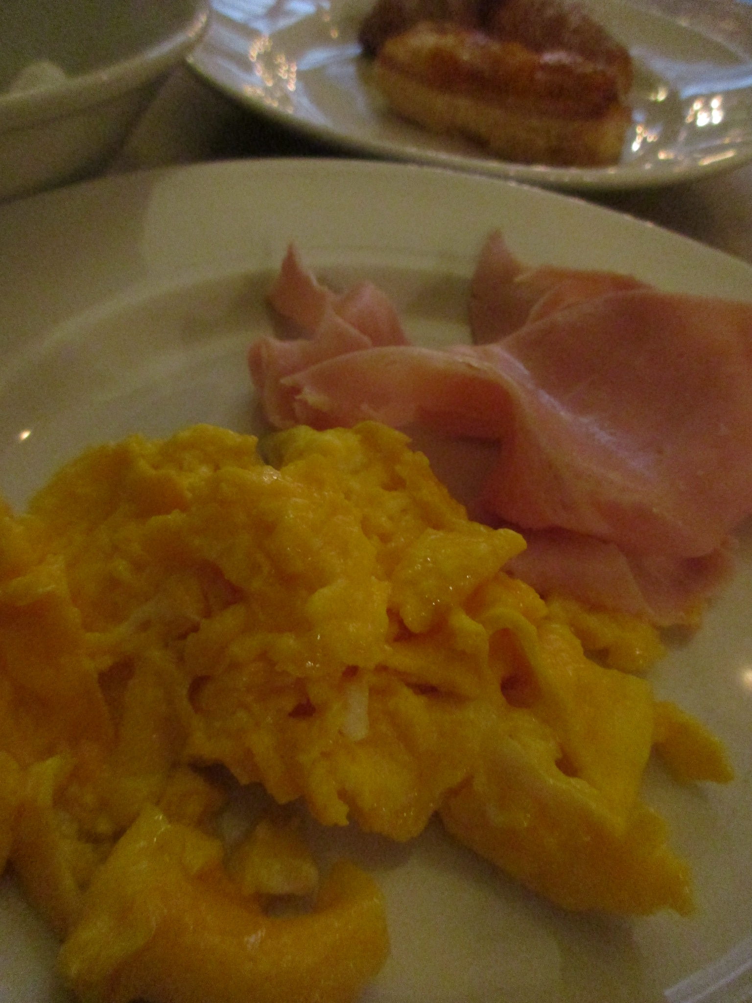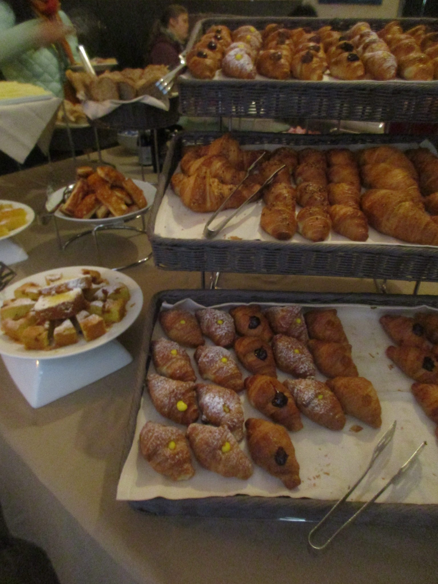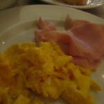 こちらは朝の様子、ブッフェは左のソファー奥を入った別のホールになります。ランチではシャツにネクタイだったスタッフも、朝はカジュアルにTシャツです。ブッフェは、各種クロワッサン、各種ハム、各種チーズ、パン、各種紅茶、ジュース、コーヒーなど。